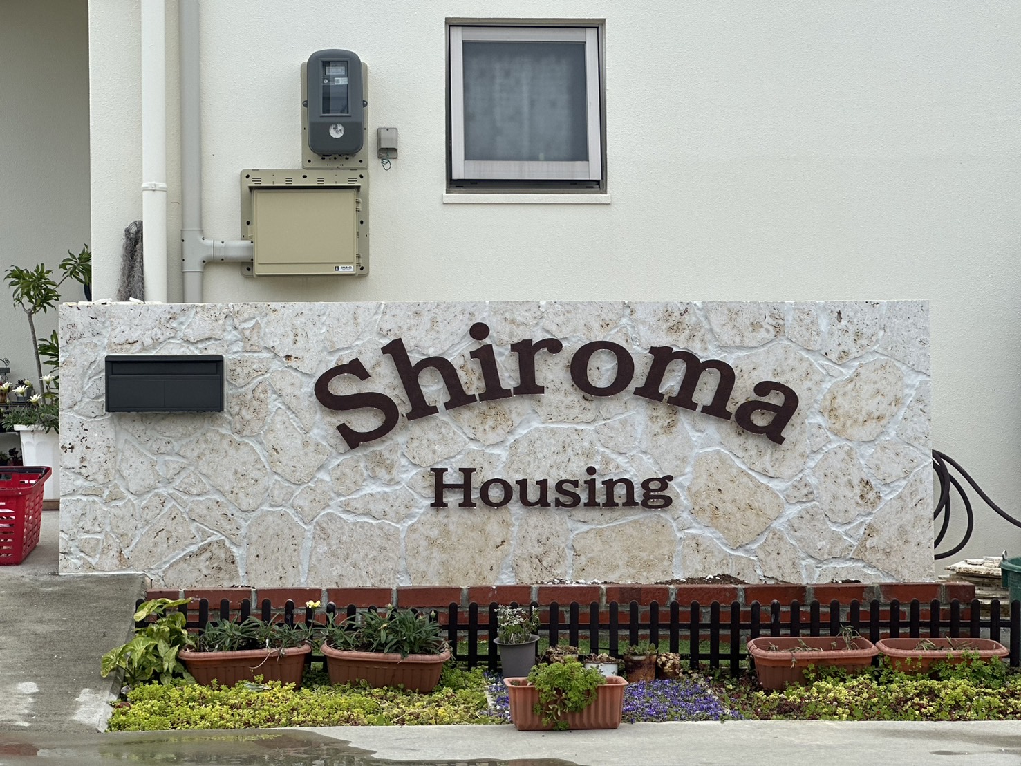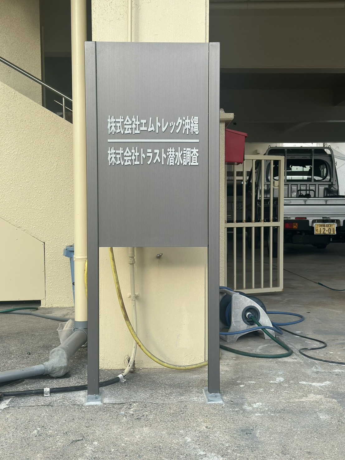 透明アクリルにダイノックシートを貼り切り文字ピンたてサイン。文字は浮かしてありますが、台風の多い沖縄でも十分に耐えれるよう施工してあります。